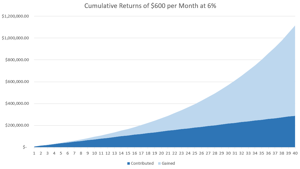 Now, you all you have to do is continue to invest in appreciating assets and have time work for you. The younger you are, the better time can serve you. Hypothetically, if you started today, investing $600 each and every month, and you are able to achieve a very modest return of 6% per year on average, you would have approximately $1 million dollars in 38 years.