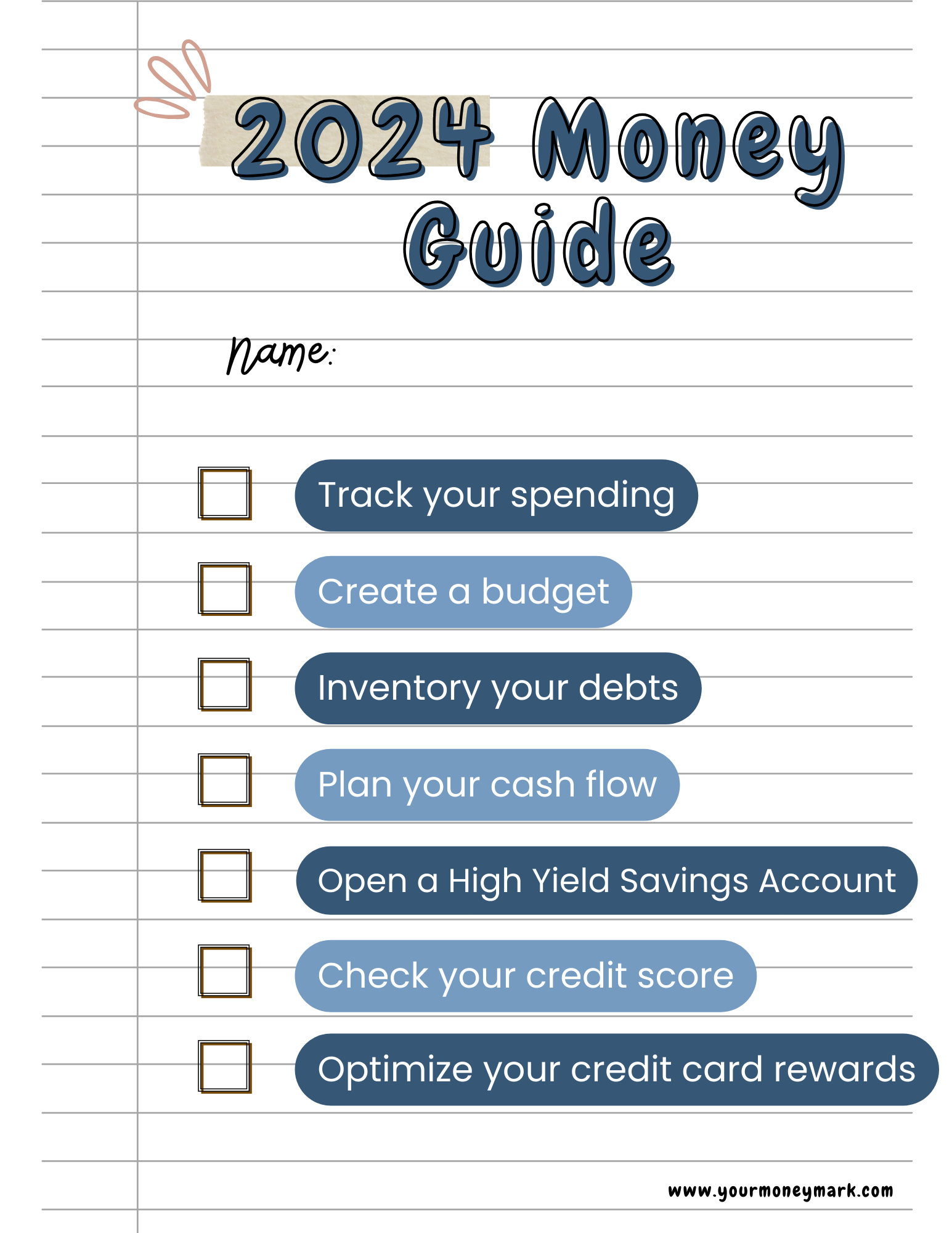 Want to follow these steps and create your own checklist? No need – download The 2024 Money Guide here and follow along. Let me know how you progress throughout the year!