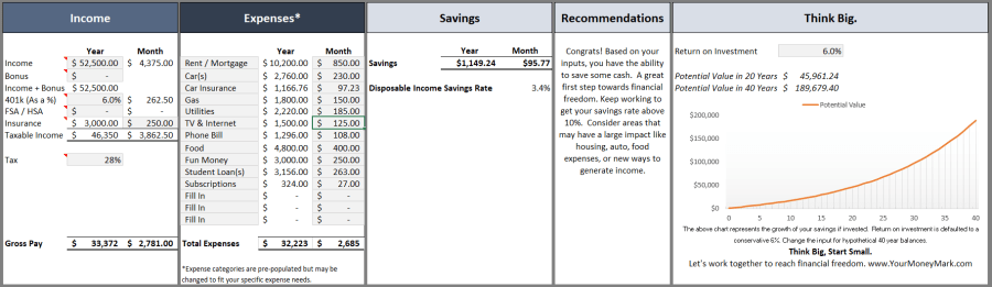The second tab is a budgeting spreadsheet where you can enter your income and expenses to see how much money you should be able to save each month. Change up the inputs to see how increasing your income or decreasing your spending can impact your ability to save!