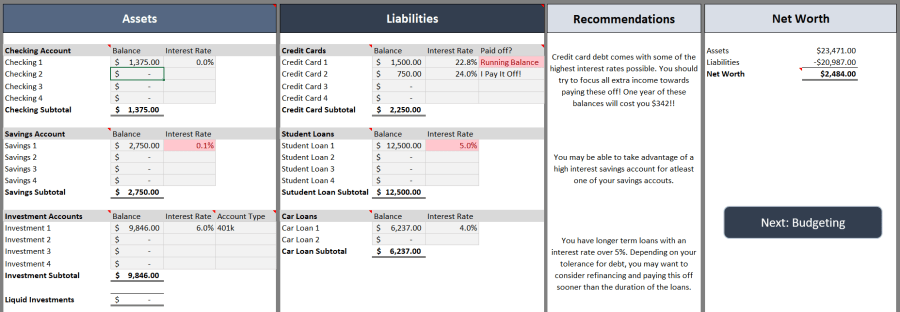 The first page of the spreadsheet will take all of your accounts and add them up to show you your overall financial position, or your Net Worth.